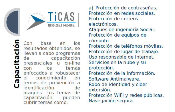 Por ello, en TICAS ofrecemos a nuestros clientes cursos presenciales, on-line y workshops con temas actuales que cubren la mayoría de los aspectos importantes de la seguridad de la información. De acuerdo a las características de su empresa u organización nuestros cursos están dirigidos a Dirección y Gerencia, Personal técnico, Personal y Empleados y estos contribuyen a realizar las acciones de capacitación adecuadas a cada área, lo que le permitirá concentrarse en los temas específicos en materia de seguridad de la información que mejor se adapten. El objetivo final se centra en cambiar los comportamientos y reducir el riesgo de sus usuarios y fortalecer el conocimiento y habilidades de sus encargados de TIC y áreas de seguridad internas.